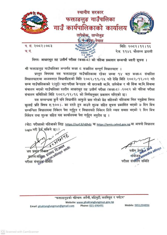 आधारभूत तह उत्तीर्ण परीक्षा २०८२ को नतिजा सार्वजनिक गरिएको सूचना
